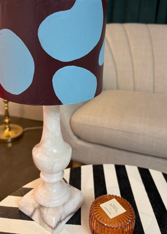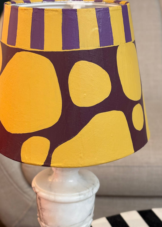 Each lamp features a refurbished lamp foot, complemented by a brand-new, hand-painted lampshade, and updated wiring and socket for safe and modern functionality.
