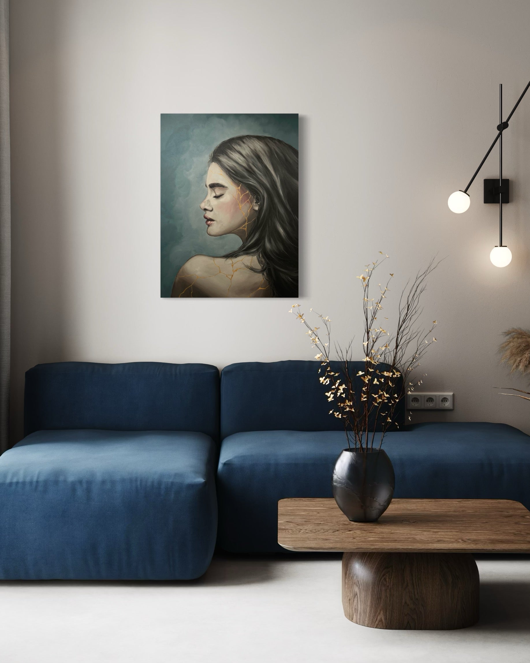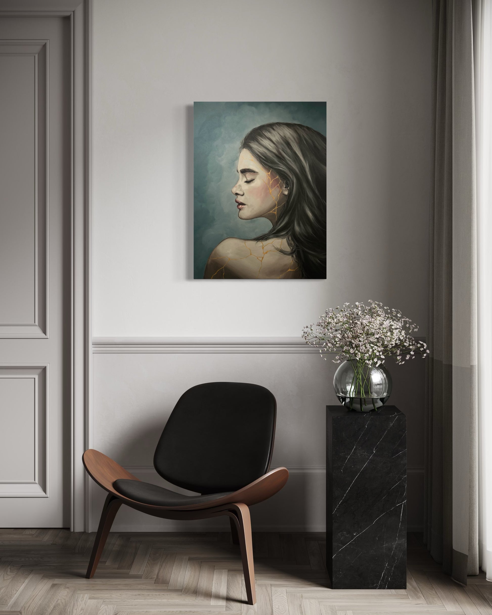 This painting is inspired by the Japanese philosophy of Kintsugi — the art of repairing broken pottery with gold. Instead of concealing the cracks, Kintsugi celebrates them, transforming what was once broken into something more precious.